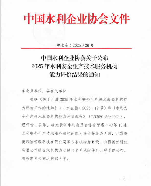 近日,中国水利企业协会印发《2025年水利安全生产技术服务机构能力评价结果的通知》,本次评级全国共产生24家达标单位,其中A级13家、B级6家、C级5家,宁波子规信息科技有限公司凭借扎实的技术实力、规范的服务体系与良好的行业信誉,荣获最高等级——A级。这是我司发展进程中的重要里程碑,标志着公司的专业能力与服务水平获得国家级权威认证,为开拓市场和深耕客户服务提供强有力支撑。