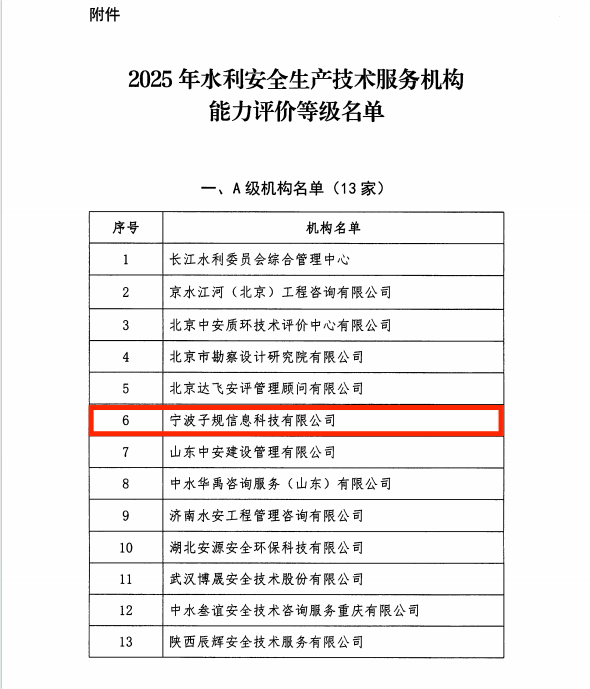 近日,中国水利企业协会印发《2025年水利安全生产技术服务机构能力评价结果的通知》,本次评级全国共产生24家达标单位,其中A级13家、B级6家、C级5家,宁波子规信息科技有限公司凭借扎实的技术实力、规范的服务体系与良好的行业信誉,荣获最高等级——A级。这是我司发展进程中的重要里程碑,标志着公司的专业能力与服务水平获得国家级权威认证,为开拓市场和深耕客户服务提供强有力支撑。